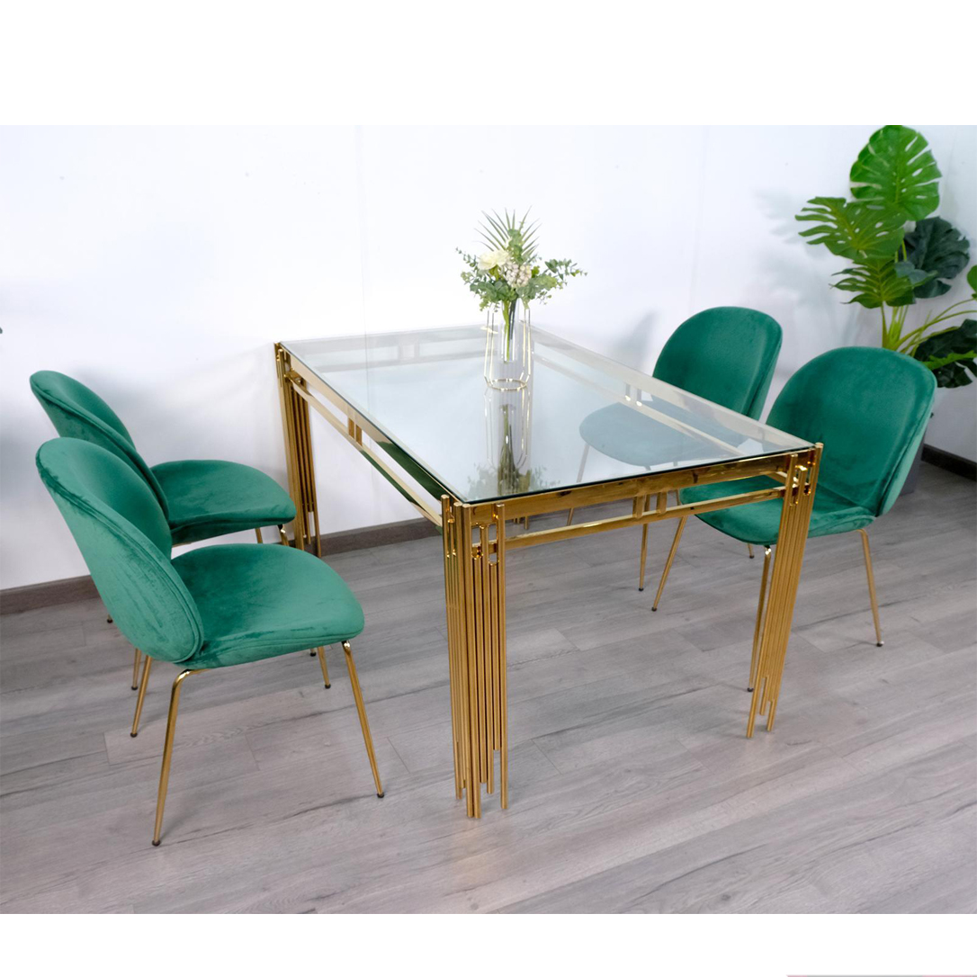 Bộ Bàn Ăn Luxury Kính 8mm Chân Mạ Vàng Siêu Phẩm của Năm – Kích Thước 1.4m x 80cm và 4 Ghế Bọc Nệm Cao Cấp