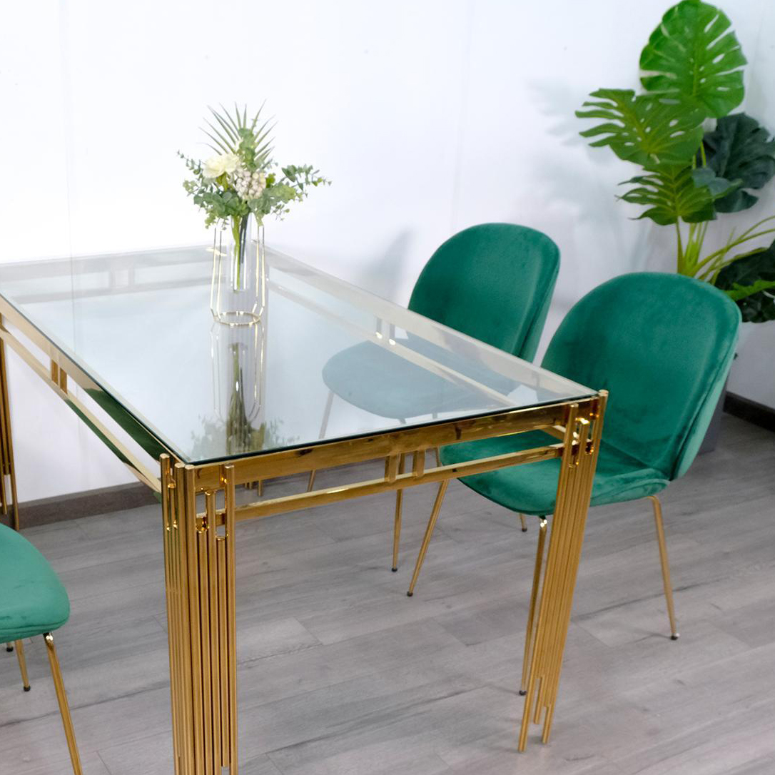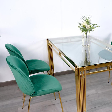• Bộ Bàn Ăn Luxury Kính 8mm Chân Mạ Vàng AZP Siêu Phẩm của Năm - Kích Thước 1.4m x 80cm và 4 Ghế Cao Cấp