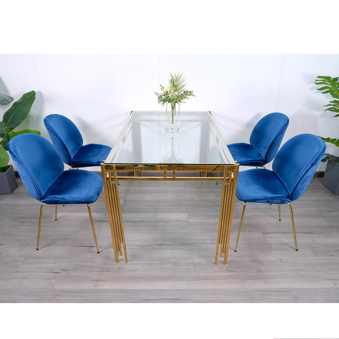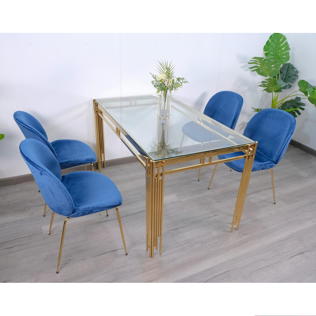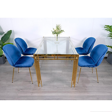 Bộ Bàn Ăn Luxury Kính 8mm Chân Mạ Vàng Siêu Phẩm của Năm BK01 – Kích Thước 1.4m x 80cm và 4 Ghế Bọc Nệm Cao Cấp (Màu ghế ngẫu nhiên)