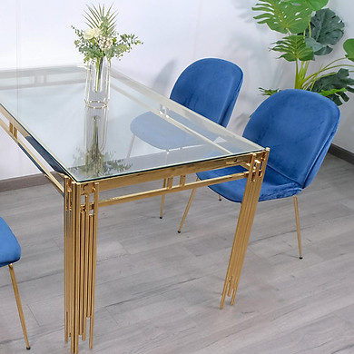 Bộ Bàn Ăn Luxury Kính 8mm Chân Mạ Vàng Siêu Phẩm của Năm – Kích Thước 1.4m x 80cm và 4 Ghế Bọc Nệm Cao Cấp
