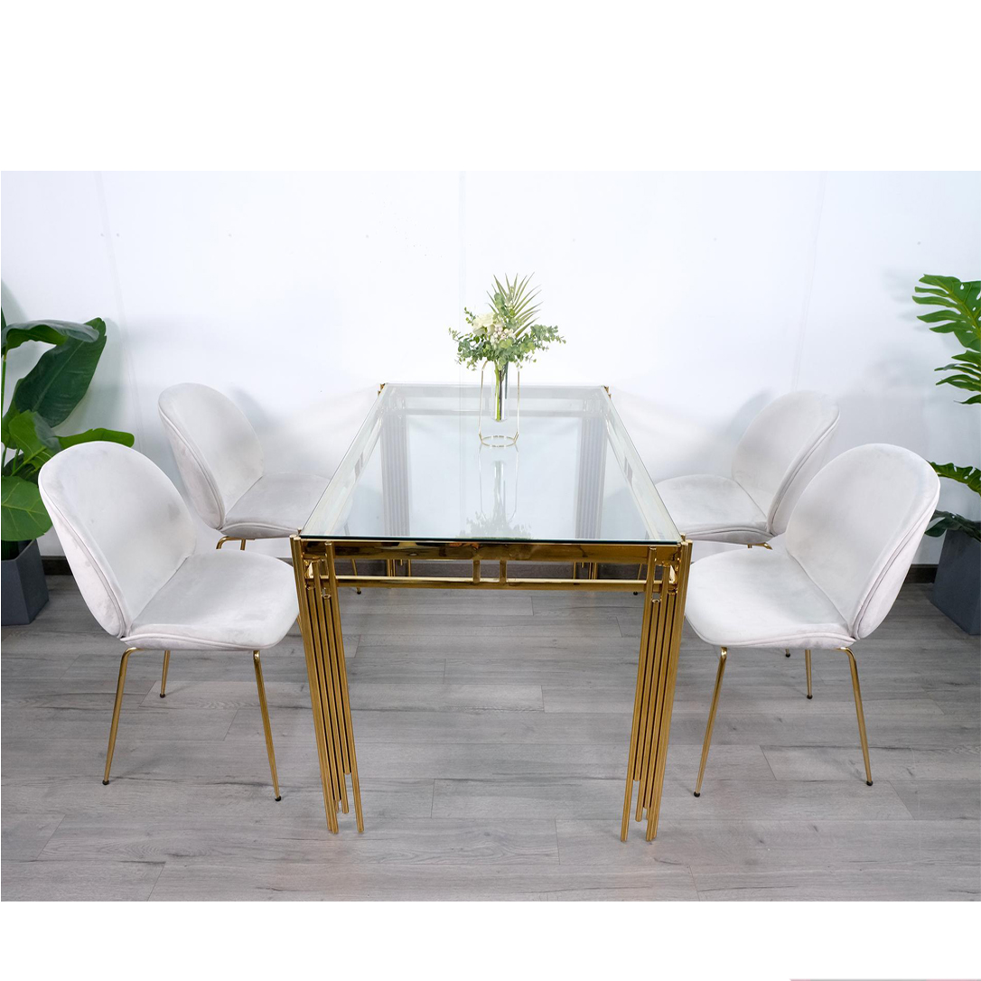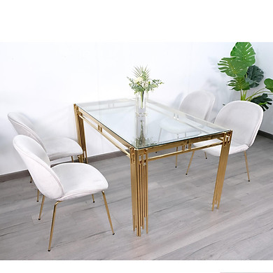 Bộ Bàn Ăn Luxury Kính 8mm Chân Mạ Vàng Siêu Phẩm của Năm – Kích Thước 1.4m x 80cm và 4 Ghế Bọc Nệm Cao Cấp (Màu ghế ngẫu nhiên)