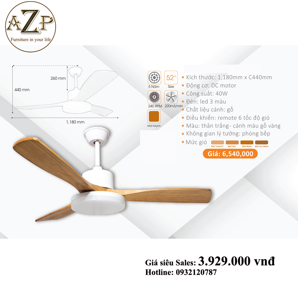 QUẠT TRẦN AZP- 3 CÁNH GỖ, CÔNG XUẤT 40W, CÓ REMOTE