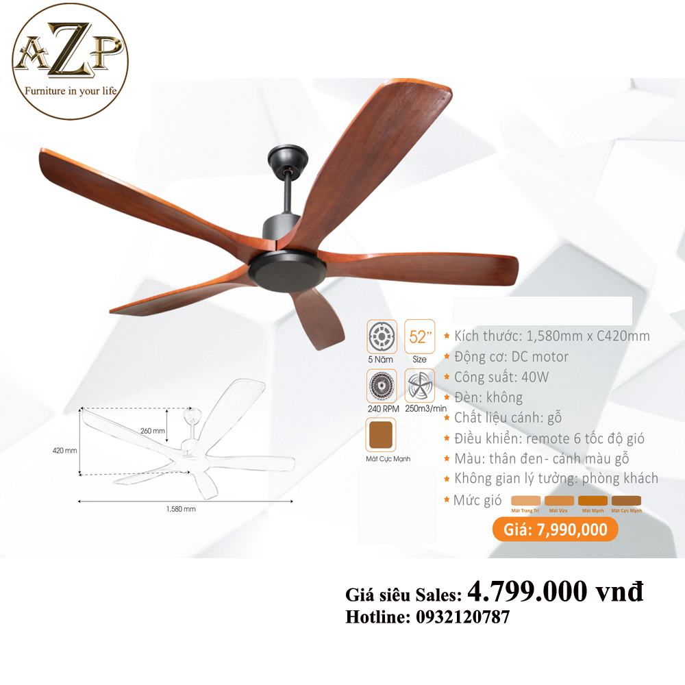 QUẠT TRẦN AZP- 5 CÁNH GỖ, CÔNG XUẤT 40W, CÓ REMOTE