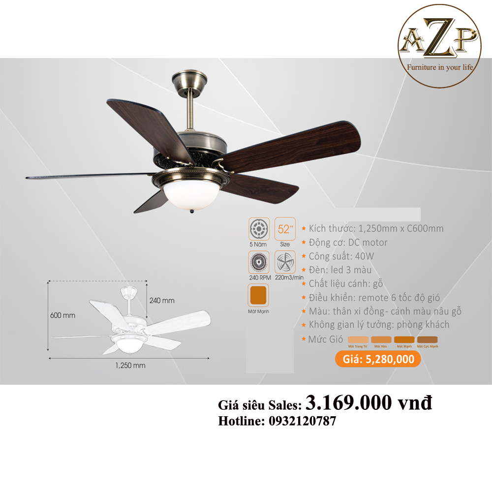 QUẠT TRẦN AZP- 5 CÁNH GỖ, CÔNG XUẤT 40W, CÓ REMOTE