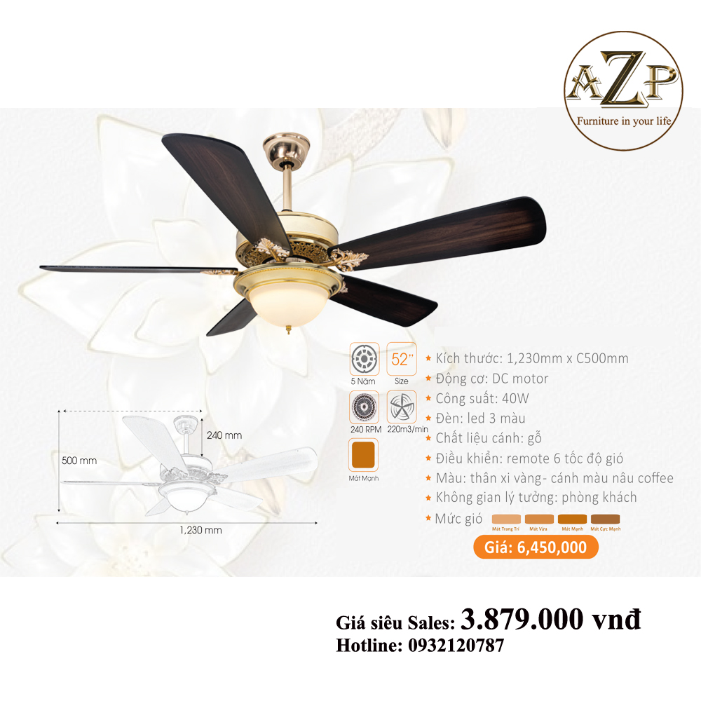 QUẠT TRẦN AZP- 5 CÁNH GỖ, CÔNG XUẤT 40W, CÓ REMOTE