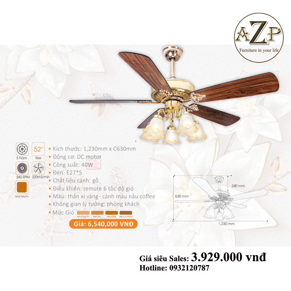 QUẠT TRẦN AZP- 5 CÁNH GỖ, CÔNG XUẤT 40W, CÓ REMOTE