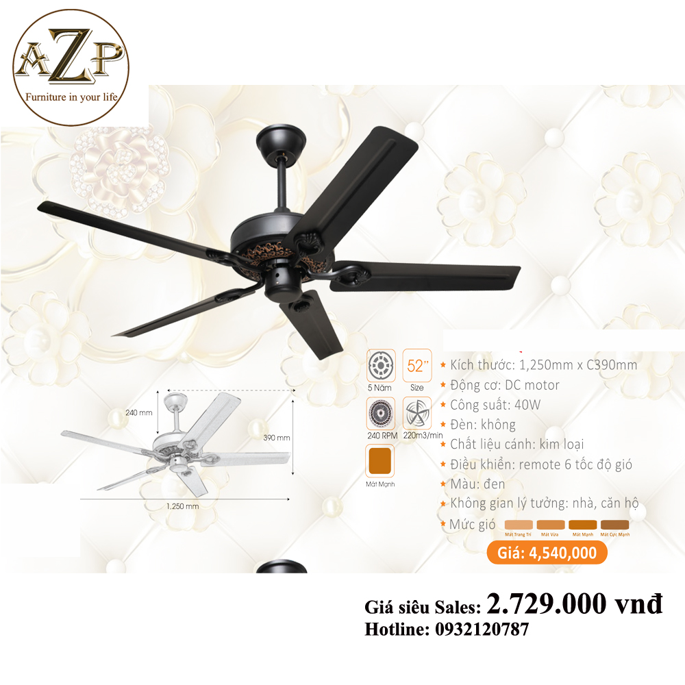 QUẠT TRẦN AZP- 5 CÁNH KIM LOẠI, CÔNG XUẤT 40W, CÓ REMOTE